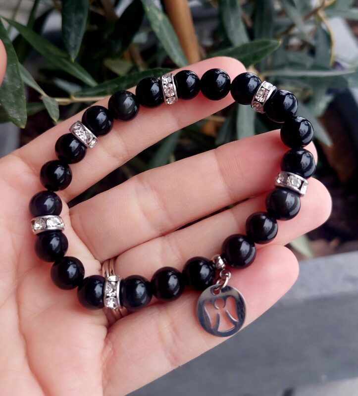 Obsidián dúhový + Krištáľ náramok 8mm Srdiečko
