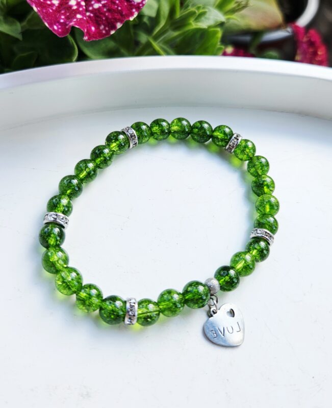 Olivínový náramok v žiarivých zelených tónoch pôsobí sviežo, luxusne a zároveň jemne očisťujúco. Jeho priezračná iskra pripomína svetlo ukryté v prírode – energiu nových začiatkov, radosti a vnútornej ľahkosti. Detail s oceľovým srdiečkom „LOVE“ dodáva šperku romantický a osobný nádych.