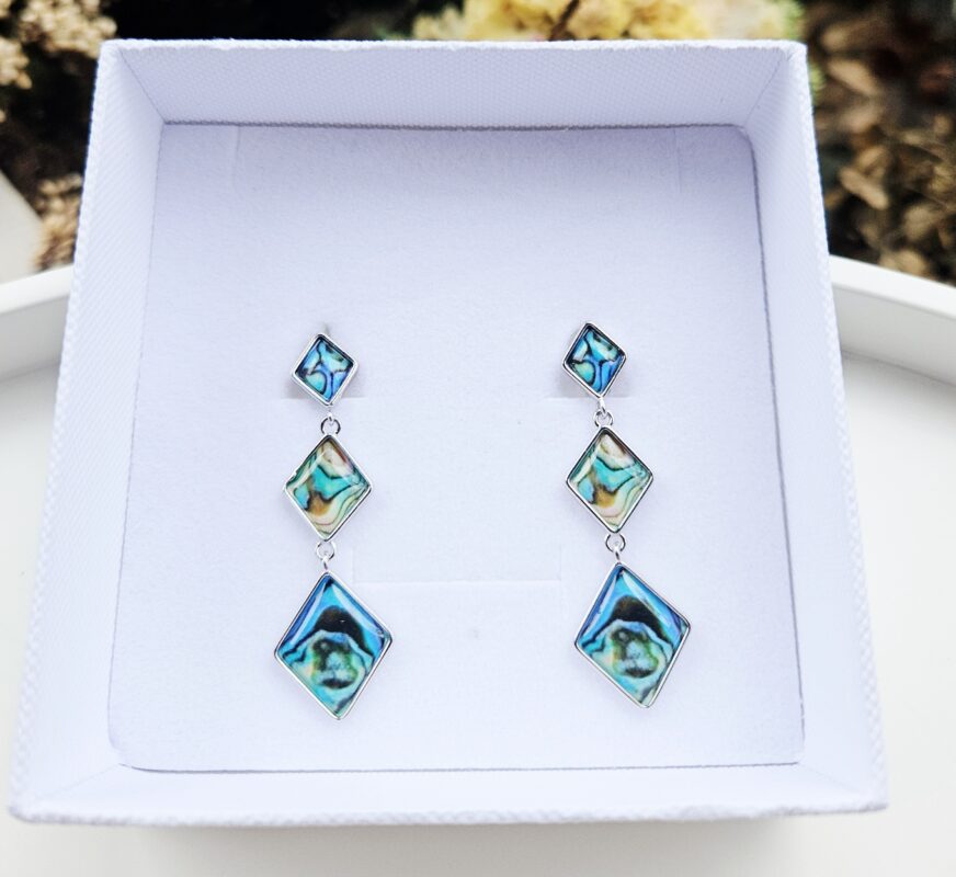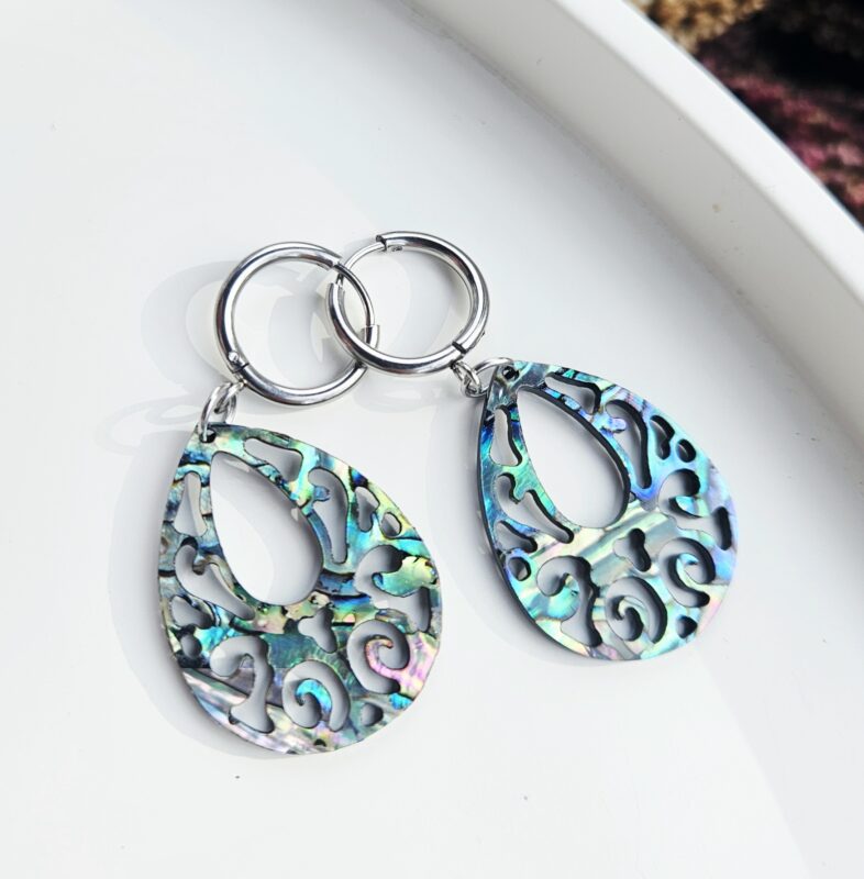Paua mušla náušnice – Oceánska kvapka strieborná chir.oceľ č.2