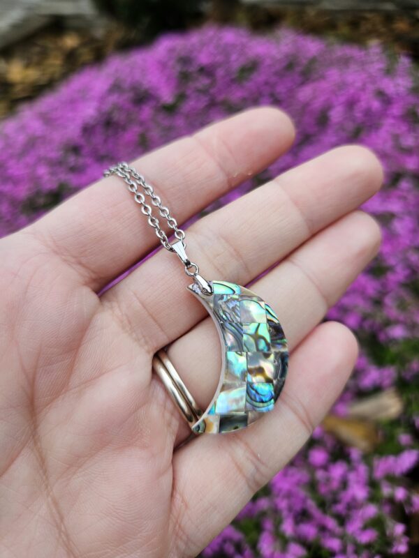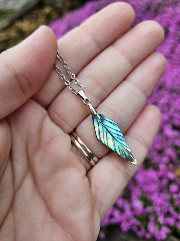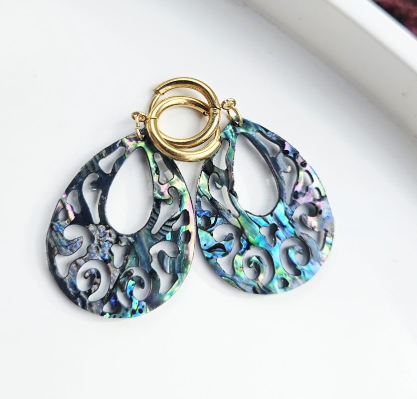 Elegantné náušnice z pravej Paua mušle zaujmú svojím jemne zdobeným tvarom, ktorý pripomína umelecké ornamenty vytvorené samotnou prírodou. Ich fascinujúce odlesky odhaľujú hru tyrkysových, modrých, zelených a perleťových tónov, ktoré sa menia s každým pohybom a svetlom.