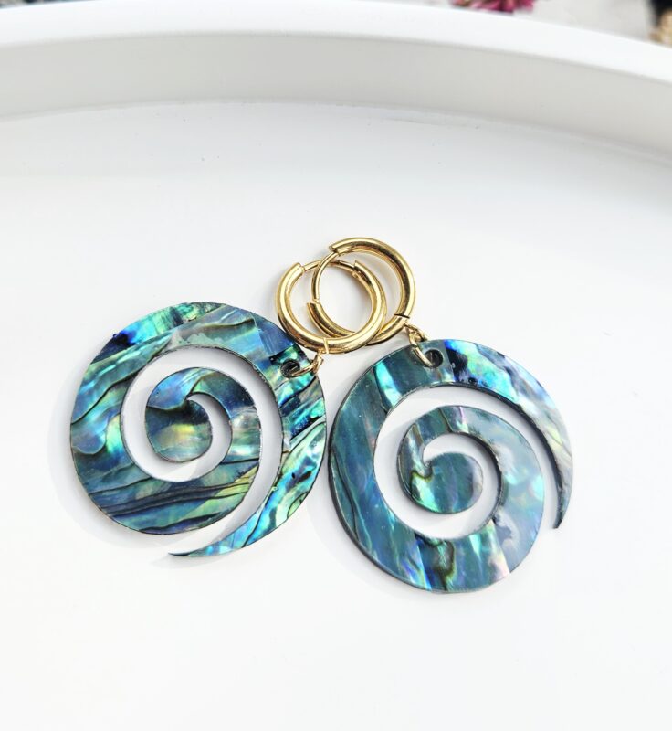 Paua mušla náušnice – Oceánska ornamentika zlatá chir.oceľ