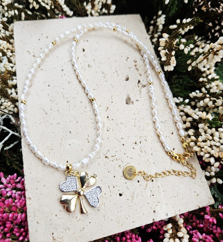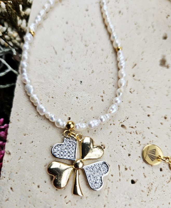 Perly riečne biele náhrdelník zlatý 4-5mm, ŠTVORLÍSTOK so zirkónmi