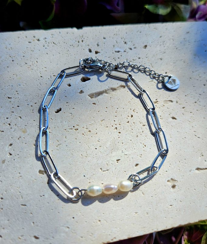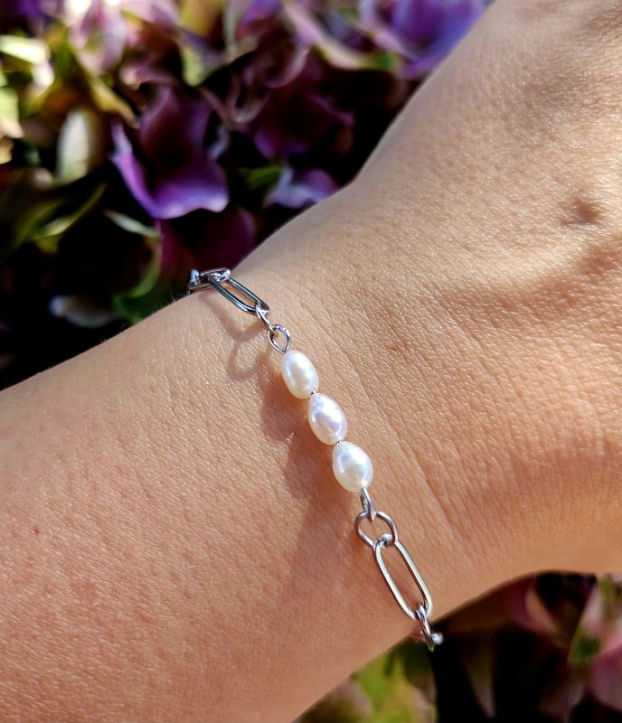 Perly riečne biele náramok – 3perly , strieborná chir.oceľ