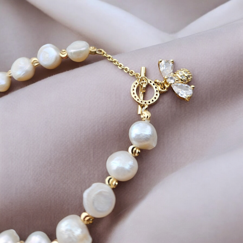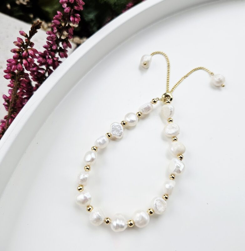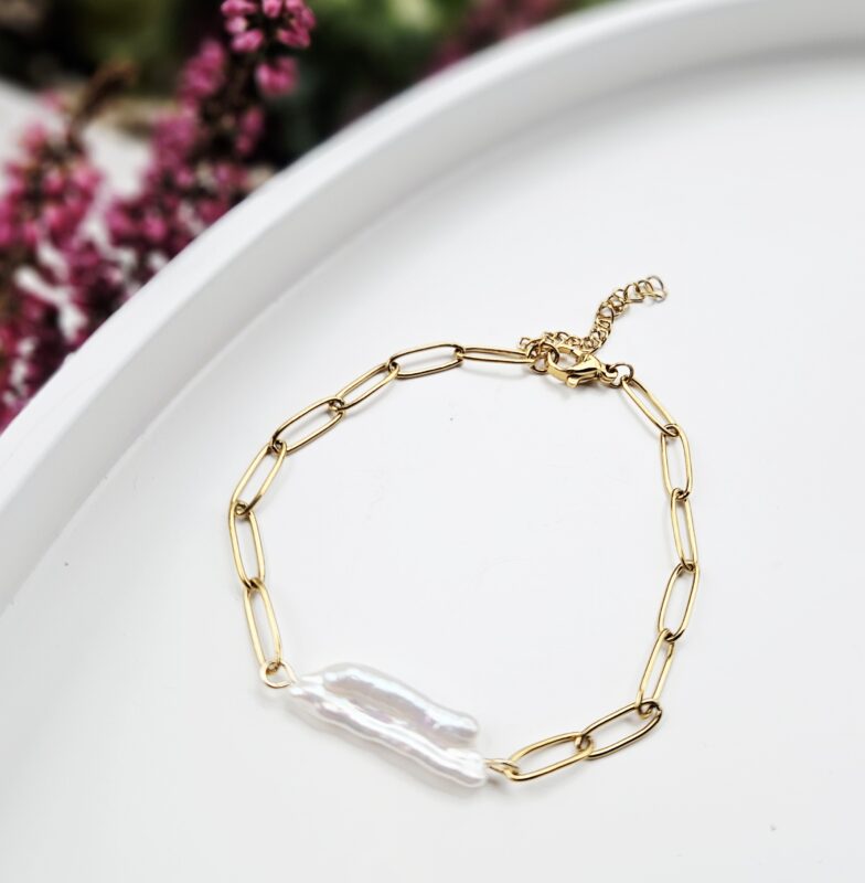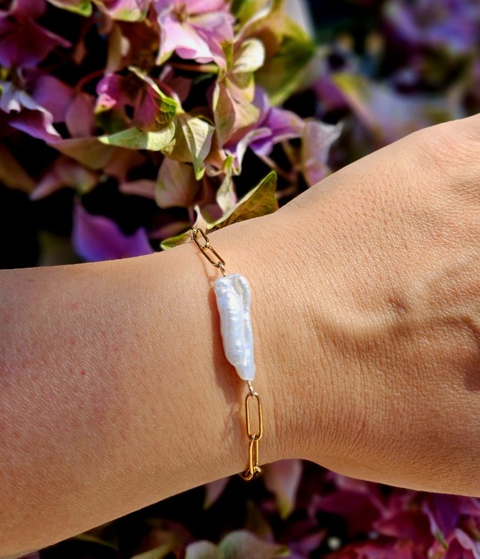 Perly riečne biele náramok – 1 perla kvet, zlatá chir.oceľ