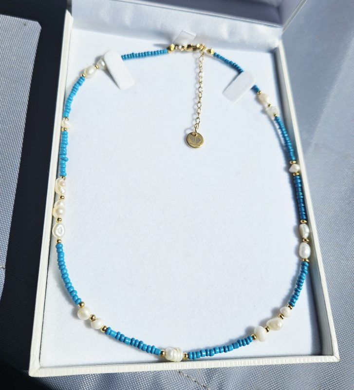 Perly riečne biele náhrdelník zlato/tyrkysový