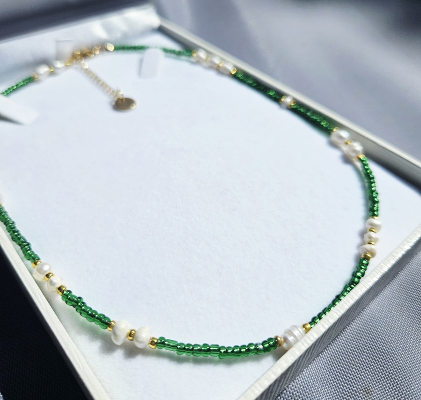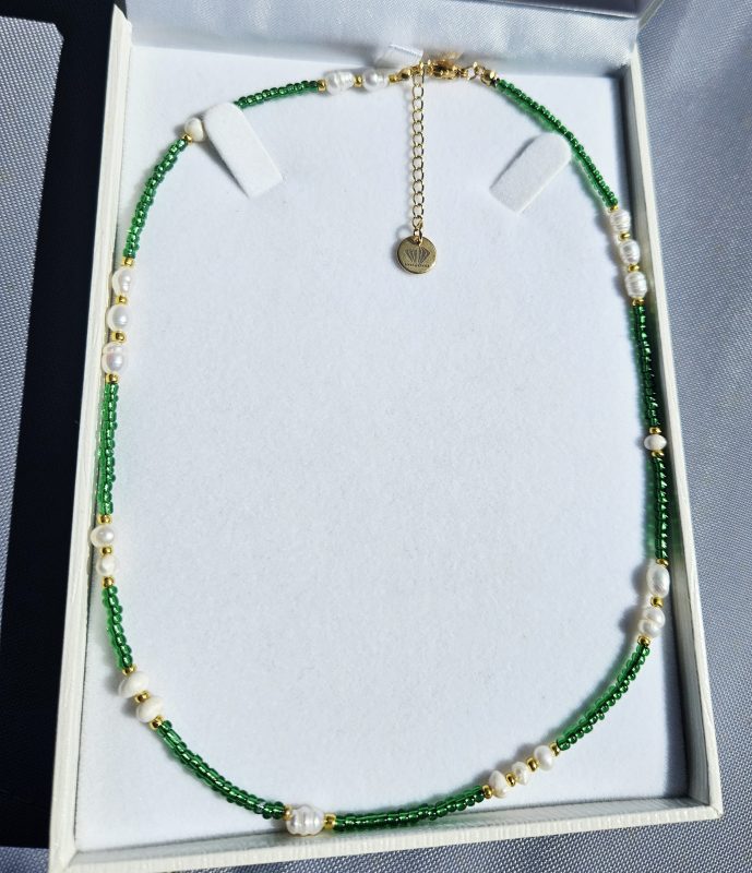 Perly riečne biele náhrdelník zlato/zelený