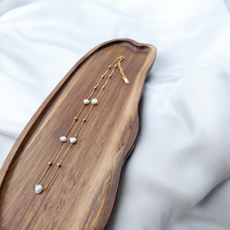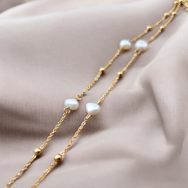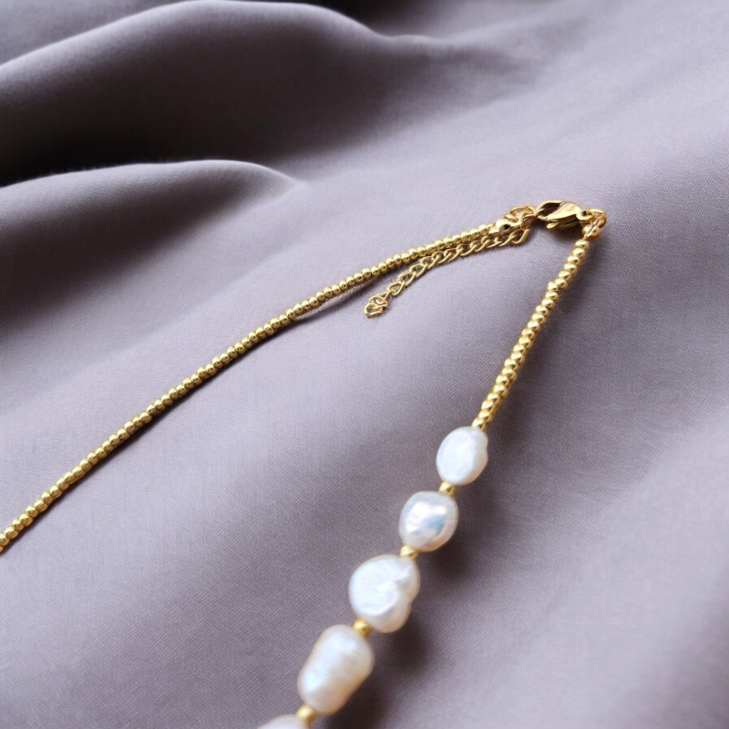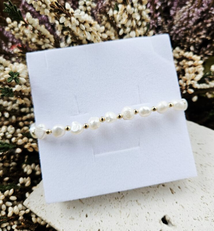 Perly riečne biele náramok – 1perla dlhá , zlatá chir.oceľ