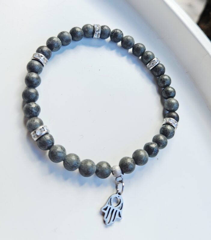 Náramok dopĺňajú prvky z chirurgickej ocele a štýlový prívesok Hamsa ruka, ktorý je symbolom ochrany, šťastia a pozitívnej energie.