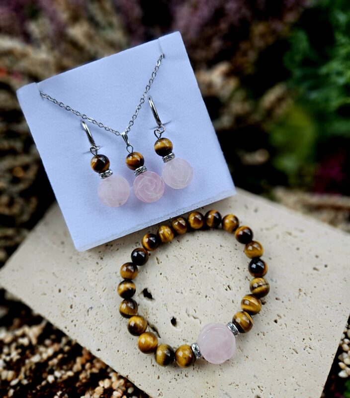 Jemný, no zároveň výrazný doplnok, ktorý spája krásu prírodných kameňov s hlbokým symbolickým významom. Ideálny ako osobný talizman alebo darček z lásky. Ruženín + Tigrie oko SET KVIETOK (náramok, náušnice, prívesok na retiazke, krabička)