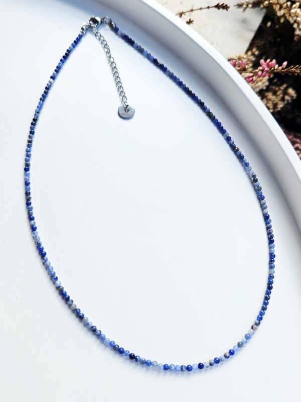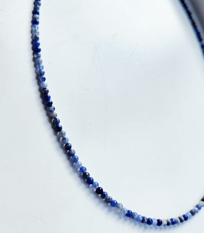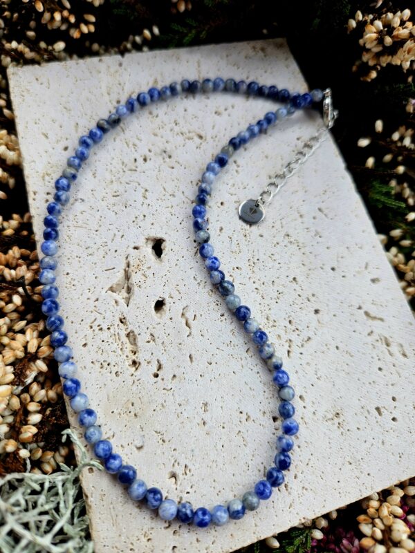 Jemný a elegantný náhrdelník z prírodného sodalitu, minerálu s nádhernou tmavomodrou farbou a typickou bielou kresbou. Sodalit je kameň pokoja, intuície a vnútornej harmónie, ktorý pôsobí veľmi decentne a zároveň výnimočne.