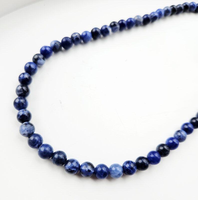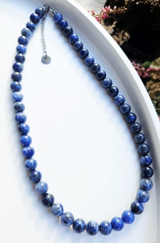 Elegantný náhrdelník zo sodalitu vyniká hlbokými odtieňmi modrej farby, ktoré dopĺňajú jemné prirodzené kresby každého kamienka. Sodalit je kameň pokoja, sebadôvery a jasného myslenia – podporuje koncentráciu, vnútornú harmóniu a pomáha vyjadriť vlastné myšlienky s istotou.