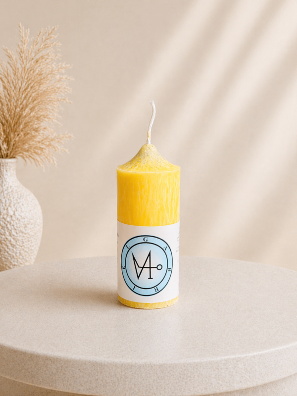 Žltá farba je spojená s 3. čakrou – Manipúrou, centrom sebavedomia, vôle a osobnej moci. Jej plameň jemne aktivuje túto oblasť, posilňuje rozhodnosť a pomáha pretaviť sny do reality.