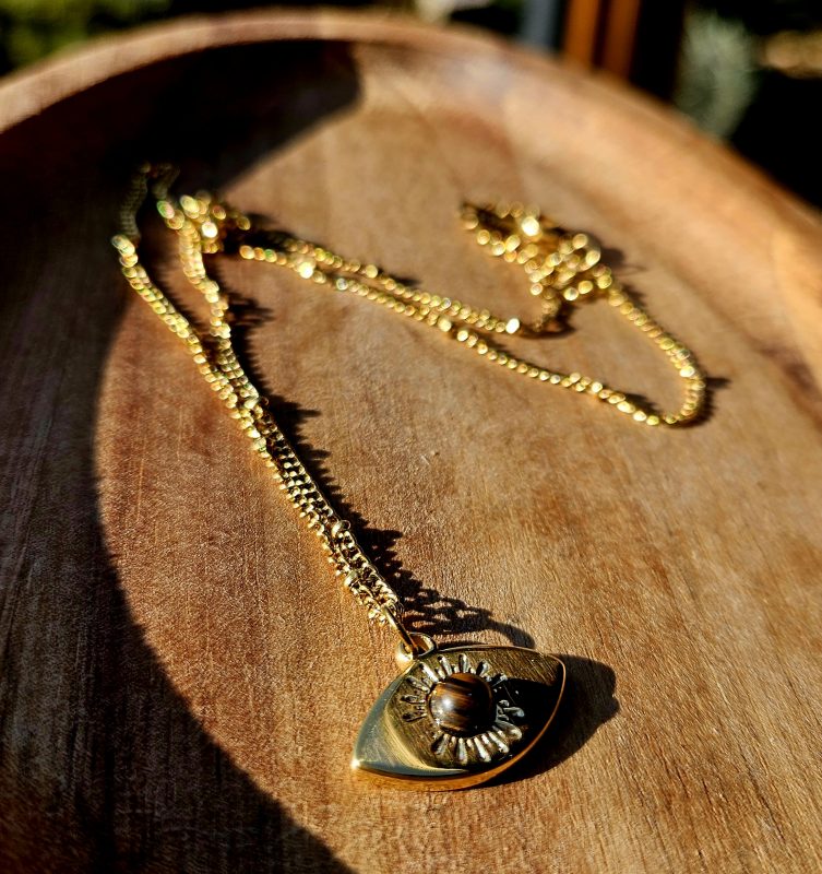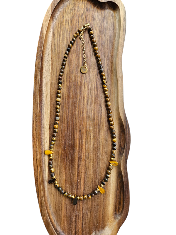 Tigrie oko náhrdelník, zlatá chir.oceľ oko