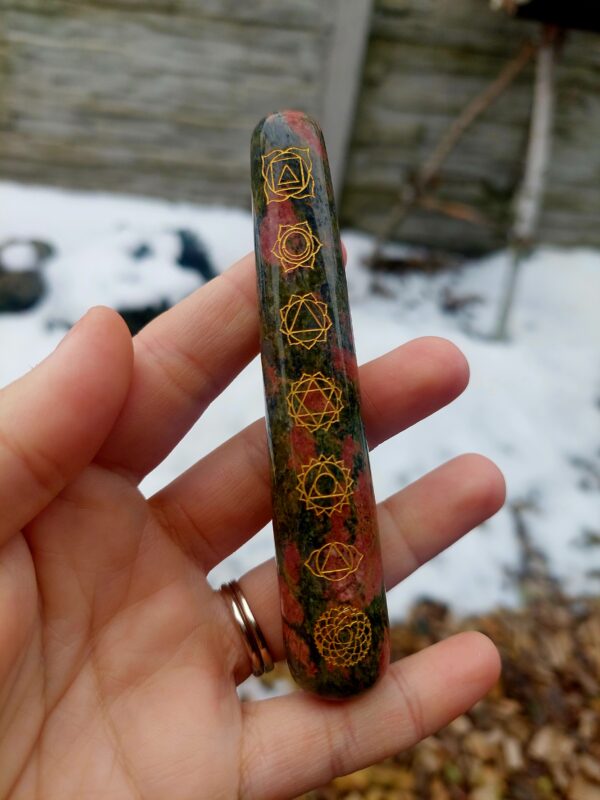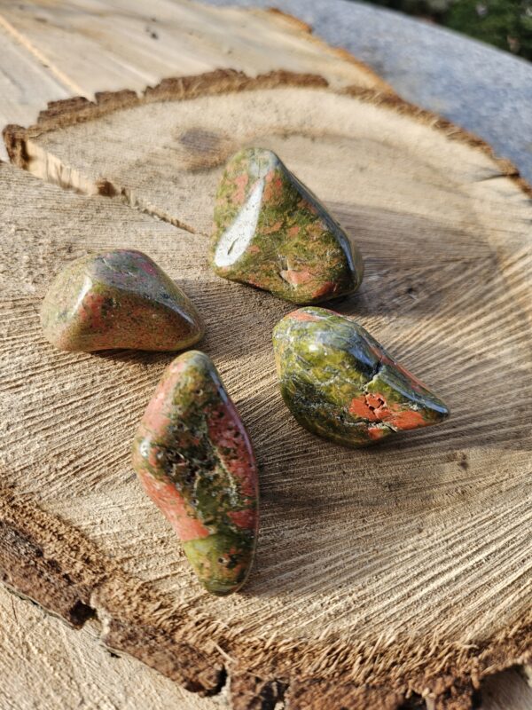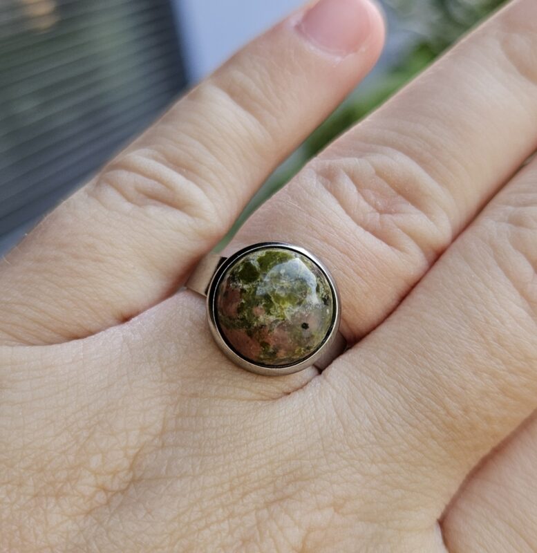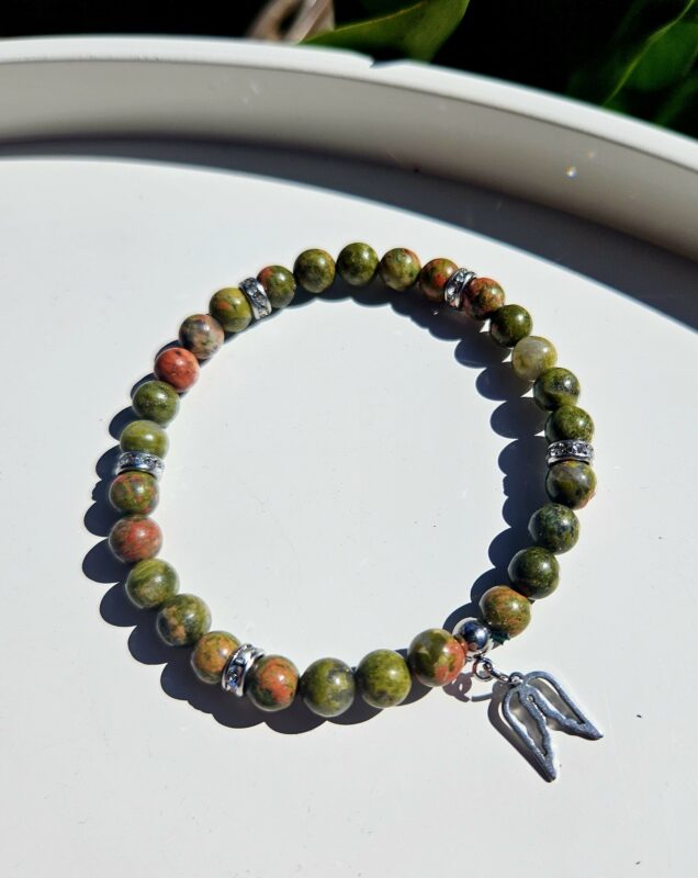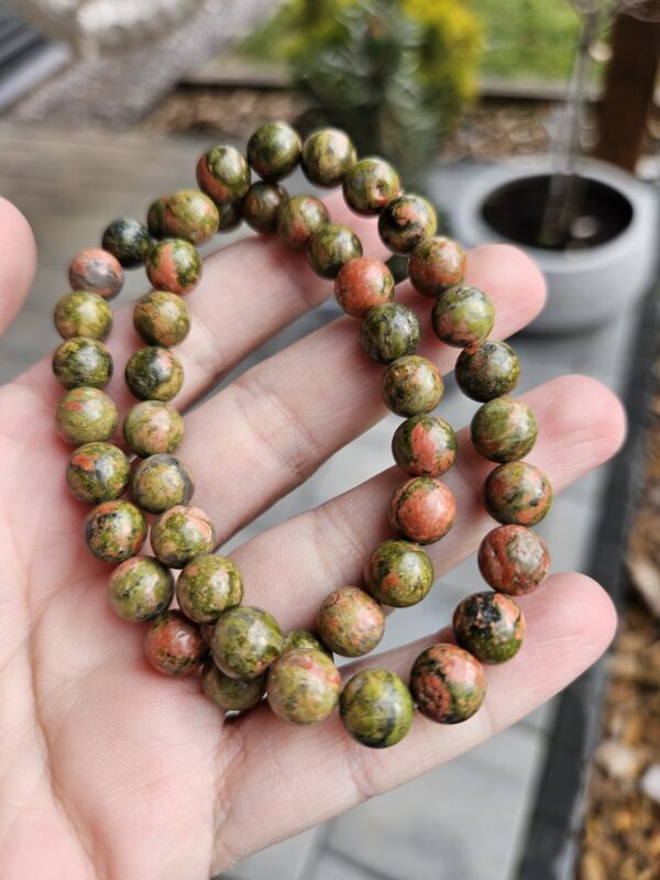Náramok z prírodného unakitu v jemnej kombinácii zelených a tehlovo-červených odtieňov, ktorý pôsobí harmonicky a elegantne. Každá guľôčka je originál, vďaka čomu je každý kus jedinečný.